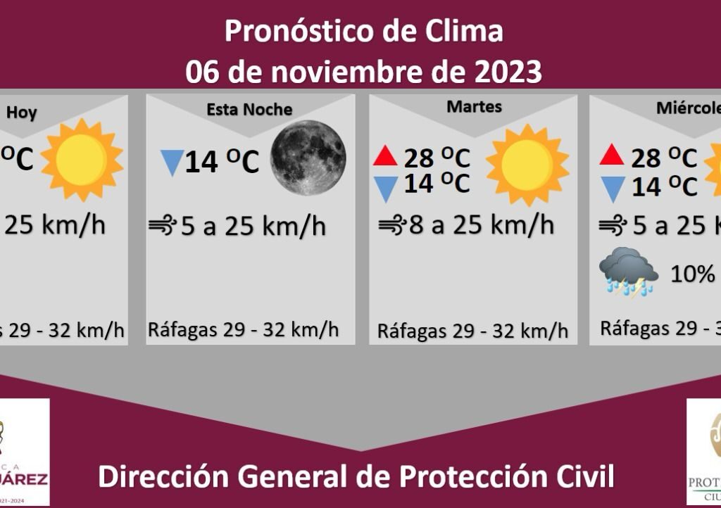 La Dirección General de Protección Civil, con base en informes del Servicio Meteorológico Nacional, pronostica un lunes soleado con una temperatura máxima de 29 grados Celsius, mientras que la mínima será de 14 °C para esta noche. Roberto Briones Mota, titular de la dependencia, informó que para hoy se esperan fuertes ráfagas de viento que alcanzarán los 32 kilómetros por…