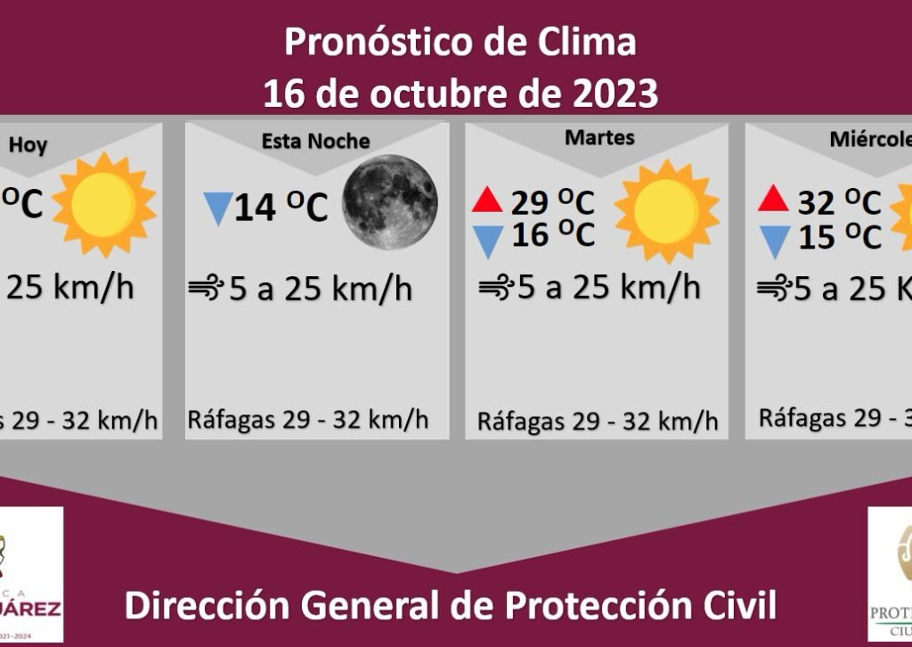 La Dirección General de Protección Civil, con base en informes del Servicio Meteorológico Nacional, pronostica un lunes mayormente soleado con una temperatura máxima de 27 grados Celsius, mientras que la mínima será de 14 °C para esta noche. Roberto Briones Mota, titular de la dependencia, informó que para hoy se esperan fuertes ráfagas de viento que alcanzarán los 32 kilómetros…