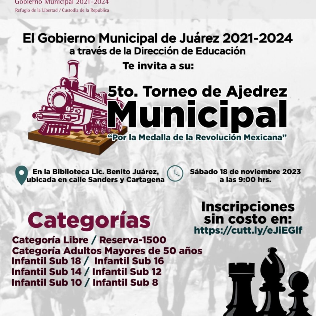 El Gobierno Municipal, a través de la Dirección de Educación, invita a la ciudadanía a participar en el Quinto Torneo de Ajedrez “Por la Medalla de la Revolución Mexicana” que se llevará a cabo mañana sábado 18 de noviembre. El evento, último del año, será en la Biblioteca Pública Municipal Benito Juárez, localizada en las calles Sanders y Sevilla, a…