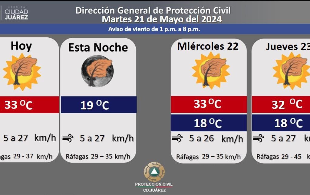 Para este martes disminuirá ligeramente la temperatura máxima, al registrarse 33 grados centígrados durante el día y 19 grados por la noche, dio a conocer la Dirección General de Protección Civil. La velocidad del viento oscilará entre 5 y 27 kilómetros por hora, con la posibilidad de ráfagas de viento con una velocidad entre 29 y 37 kilómetros de 1:00…