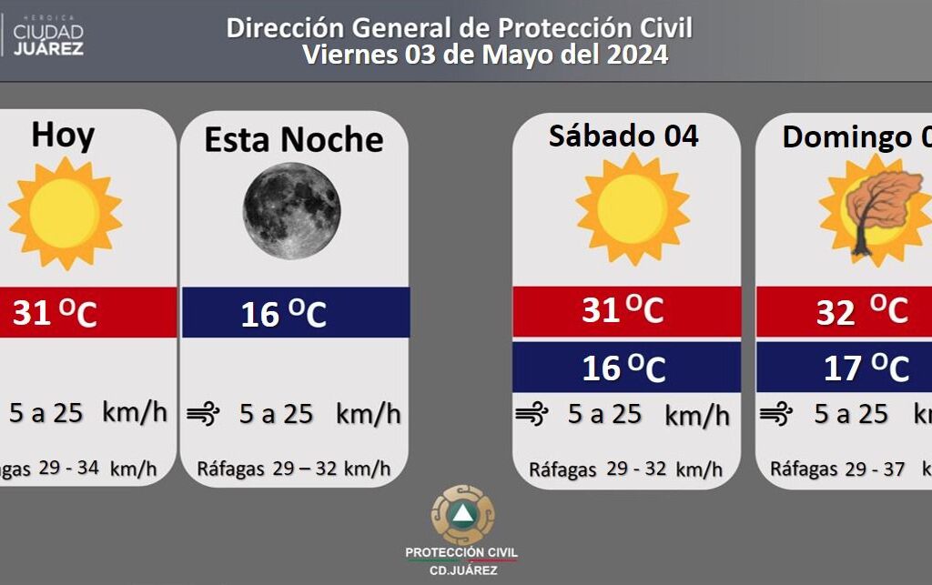 Viernes 3 de mayo de 2024.- La Dirección General de Protección Civil informa que para este día se mantiene la probabilidad de ráfagas de viento que pueden alcanzar hasta los 34 kilómetros por hora, a partir de las 2:00 de la tarde. La temperatura máxima alcanzará los 31 °C y temperatura mínima se pronostica alrededor de 16 °C. Para este…