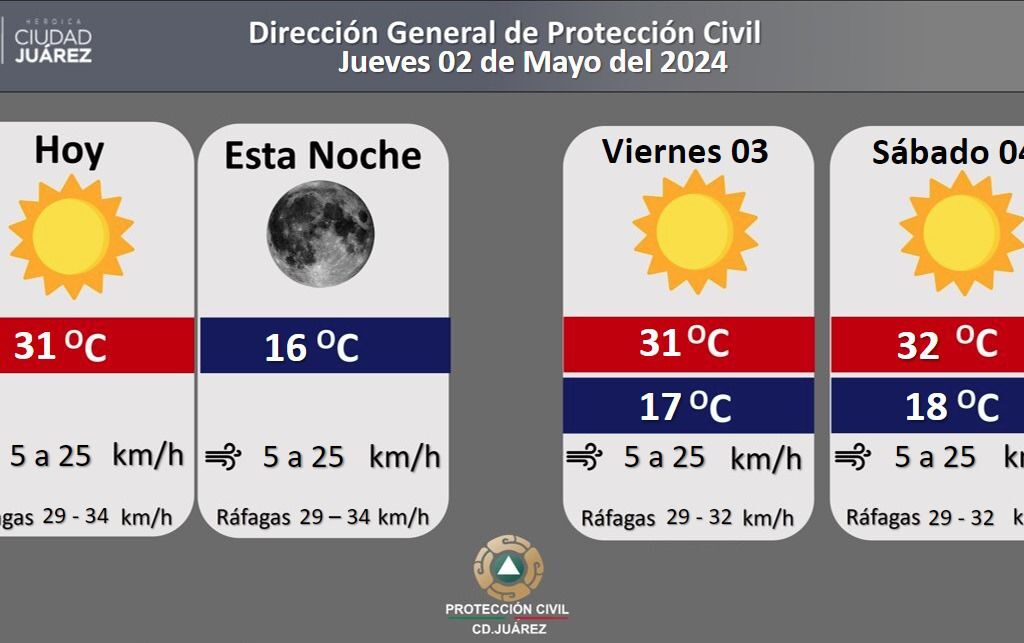 Jueves 2 de mayo de 2024.- La Dirección General de Protección Civil informa que el clima para este día continuará caluroso, la temperatura máxima está pronosticada en 31 grados Centígrados, mientras que la mínima será de 16 grados. Los vientos prevalecerán entre los 5 y 25 kilómetros por hora, en tanto que las ráfagas alcanzarán una velocidad de 29 a…