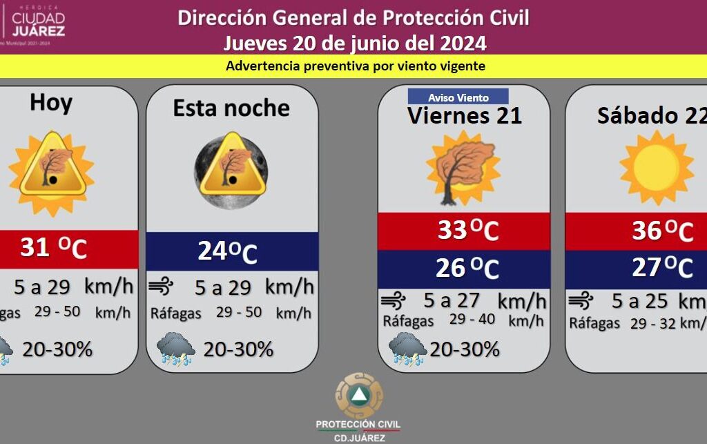 La Dirección General de Protección Civil, con base en informes del Servicio Meteorológico Nacional, pronostica un 30 por ciento de probabilidad de lluvia para este jueves, con una temperatura máxima de 31 grados Celsius, mientras que la mínima será de 24 °C para esta noche. Se informó que para hoy se esperan fuertes ráfagas de viento que alcanzarán los 50…