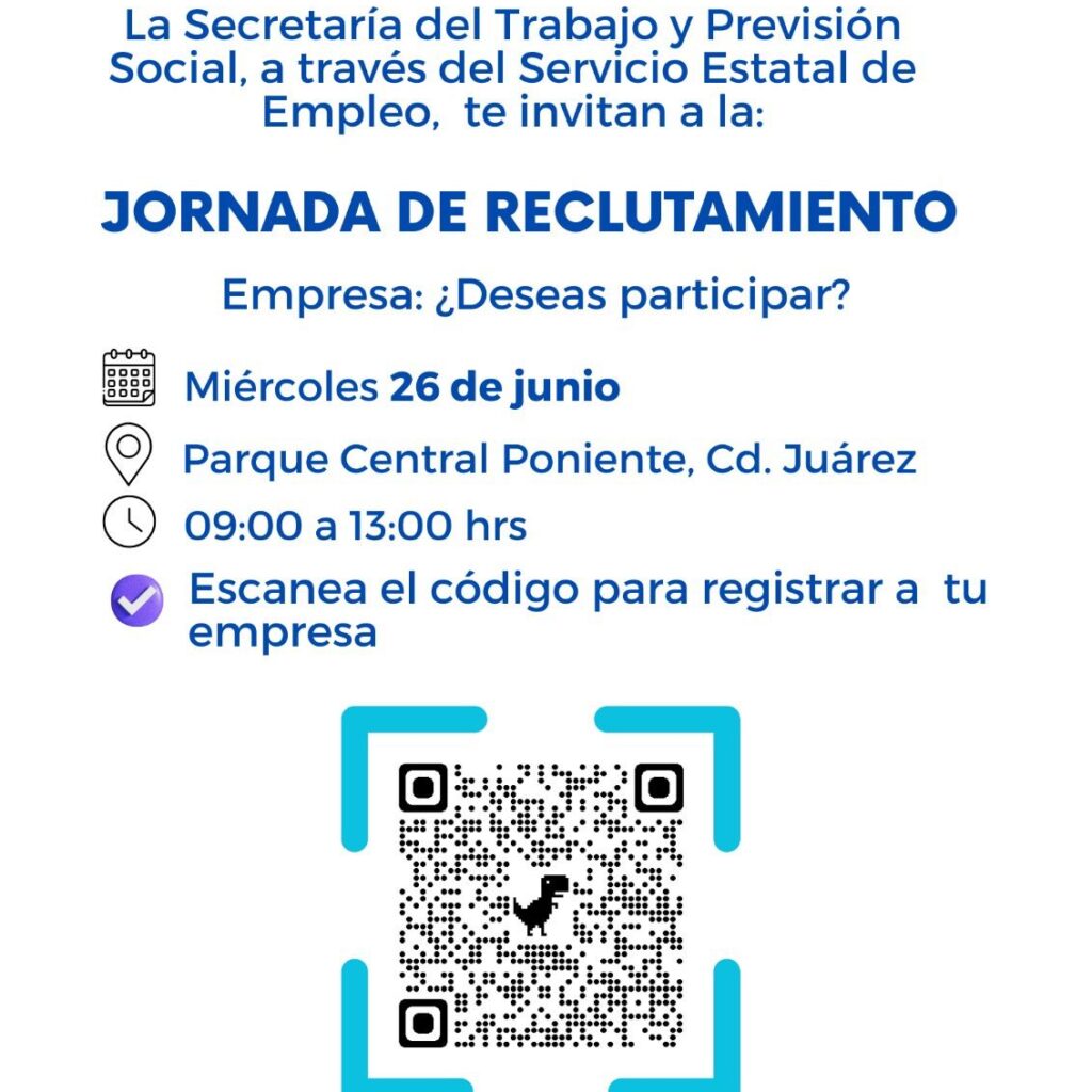 -El reclutamiento se llevará a cabo el próximo 26 de junio del 2024 en el parque central poniente La Secretaría del Trabajo y Previsión Social (STPS), a través del Servicio Estatal de Empleo (SEE), invita a todos aquellos empleadores de Ciudad Juárez con necesidades de contratación inmediatas a participar en la próxima Jornada de Reclutamiento, la cual se llevará a…
