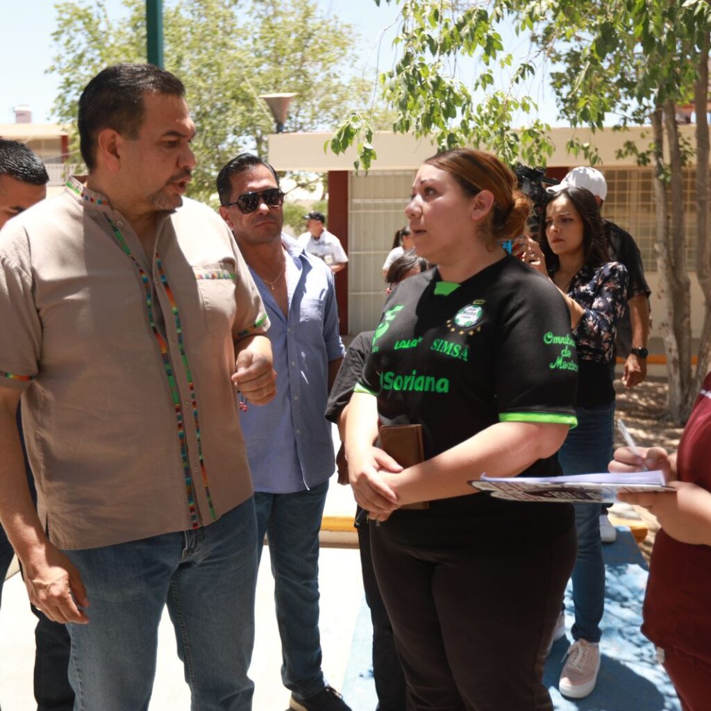 El Presidente Municipal, Cruz Pérez Cuéllar, encabezó la entrega de los trabajos de rehabilitación en la Escuela Primaria “Jesús Urueta”, ubicada en la calle 20 de Noviembre, de la colonia El Barreal. Las obras comprenden pintura exterior del plantel y la remodelación de la cancha de baloncesto. «Venimos no solamente a hacer entrega de estos trabajos, sino también a refrendar…