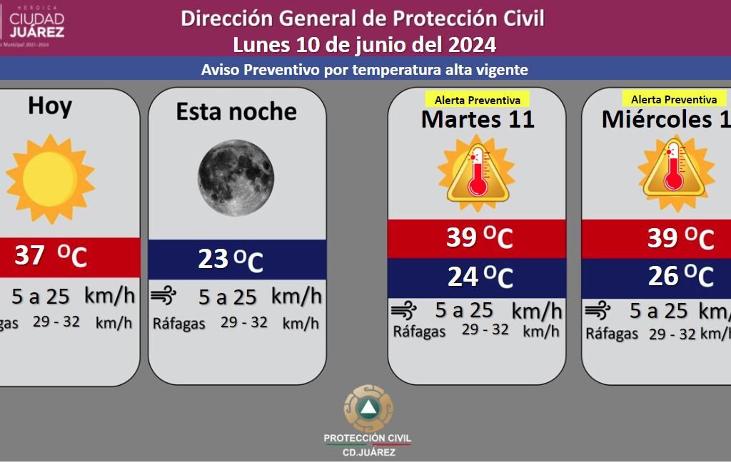 La Dirección General de Protección Civil, con base en informes del Servicio Meteorológico Nacional, pronostica un lunes mayormente soleado, con una temperatura máxima de 37 grados Celsius, mientras que la mínima será de 23 °C para esta noche, además existe una probabilidad de lluvia de un 10 a un 20 por ciento. Se informó que para hoy se esperan fuertes…