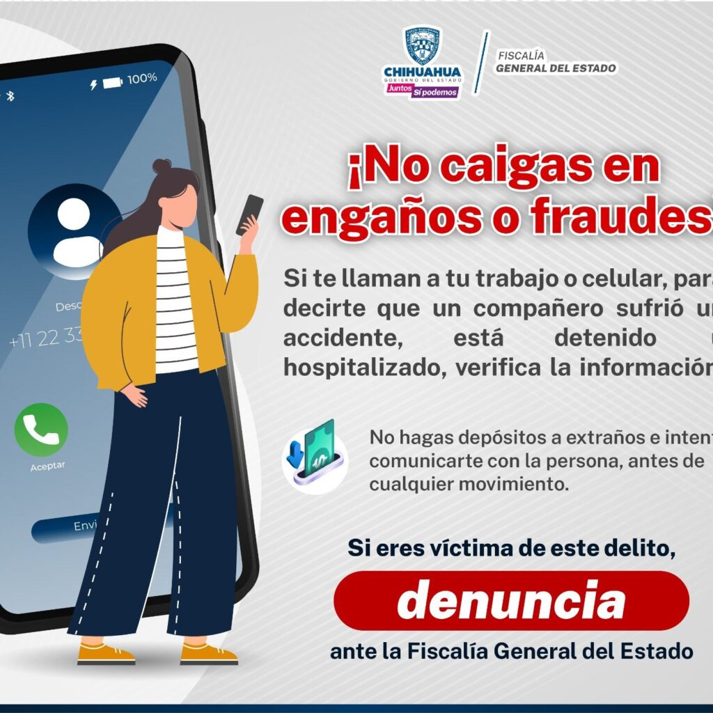 La Fiscalía General del Estado hace un llamado a la comunidad en general para evitar que sean víctimas de fraude mediante mensajes de texto y llamadas telefónicas involucrando a conocidos y familiares en situaciones falsas de peligro para obtener una cantidad de dinero. El modus operandi comienza con un mensaje de texto SMS y posteriores llamadas telefónicas que reciben los…