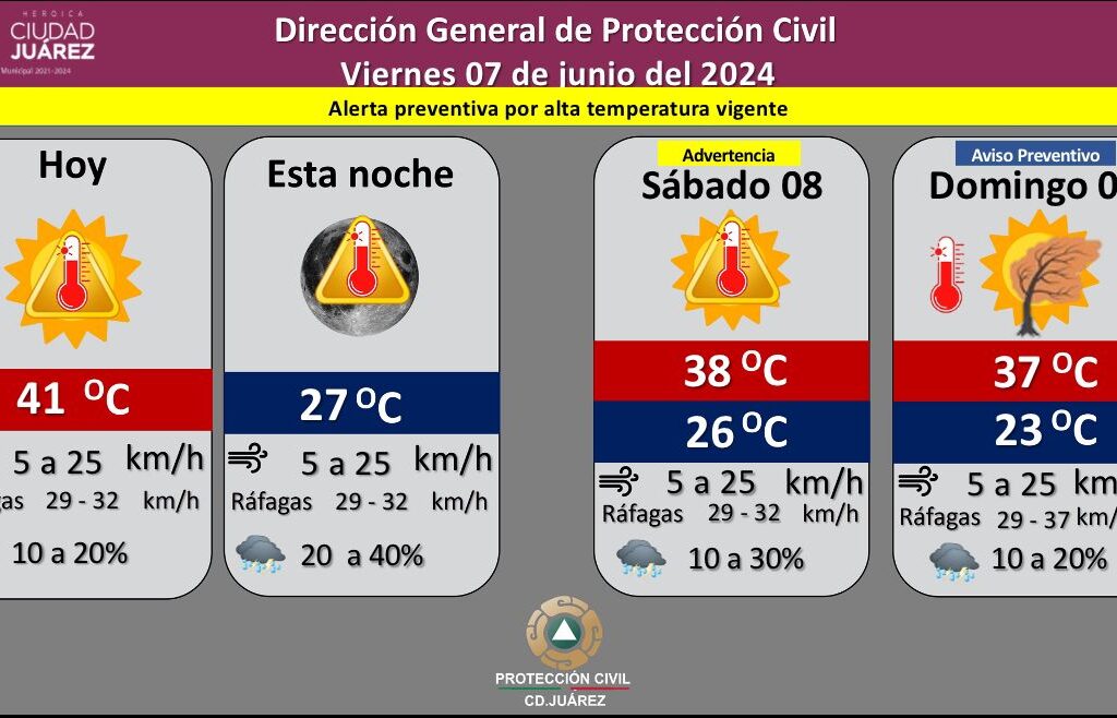 La Dirección General de Protección Civil, con base en informes del Servicio Meteorológico Nacional, pronostica un viernes mayormente soleado con una temperatura máxima de 41 grados Celsius, mientras que la mínima será de 27 °C para esta noche, además existe una probabilidad de lluvia de 20 a 40 por ciento. Se informó que para hoy se esperan fuertes ráfagas de…