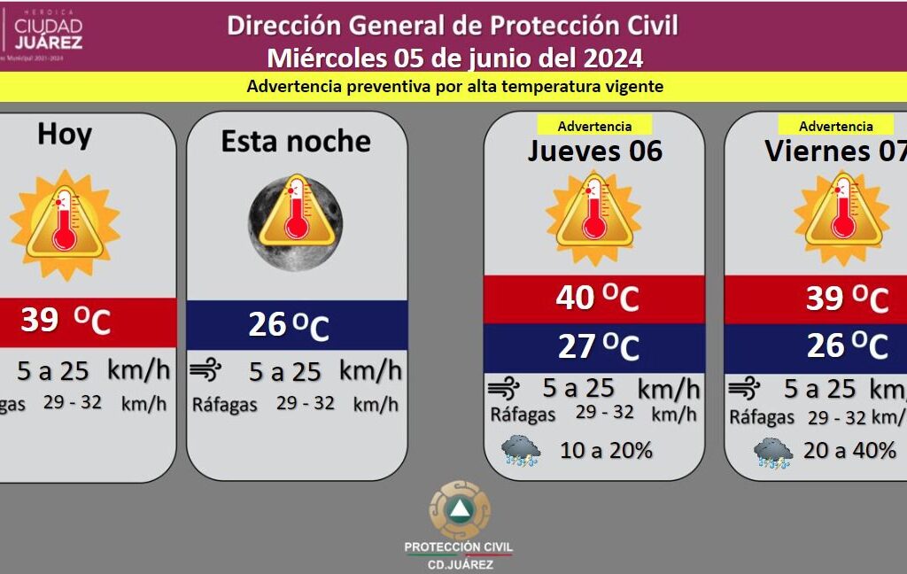La Dirección General de Protección Civil, con base en informes del Servicio Meteorológico Nacional, pronostica un miércoles mayormente soleado con una temperatura máxima de 39 grados Celsius, mientras que la mínima será de 26 °C para esta noche. Se informó que para hoy se esperan fuertes ráfagas de viento que alcanzarán los 32 kilómetros por hora, en tanto que la…