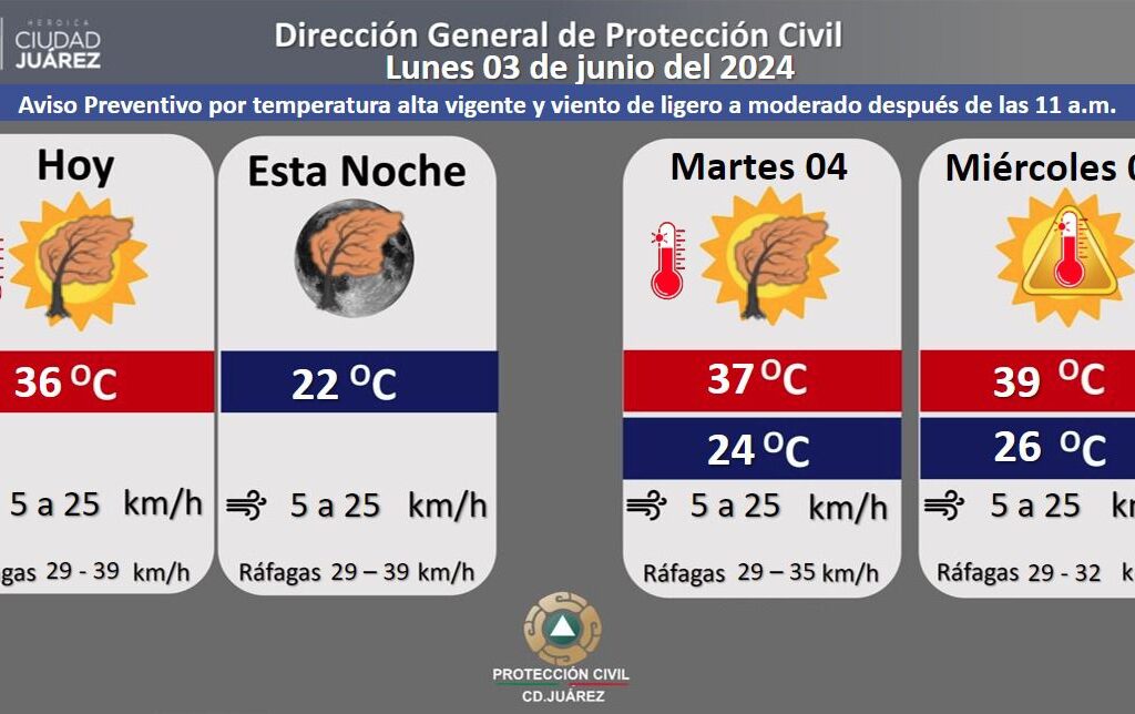 La Dirección General de Protección Civil, con base en informes del Servicio Meteorológico Nacional, pronostica un lunes mayormente soleado con una temperatura máxima de 36 grados Celsius, mientras que la mínima será de 22 °C para esta noche. Se informó que para hoy se esperan fuertes ráfagas de viento que alcanzarán los 39 kilómetros por hora, en tanto que la…