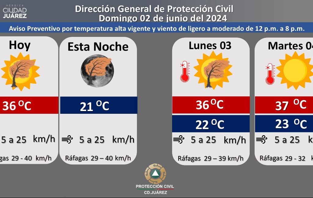 Para este domingo, la temperatura máxima se mantendrá en 36 grados Centígrados, mientras que la temperatura mínima se pronostica alrededor de 21 °Centígrados, dio a conocer la Dirección General de Protección Civil. La velocidad del viento oscilará entre 5 y 25 kilómetros por hora con la posibilidad de ráfagas de viento con una velocidad entre 29 y 40 kilómetros, pasando…