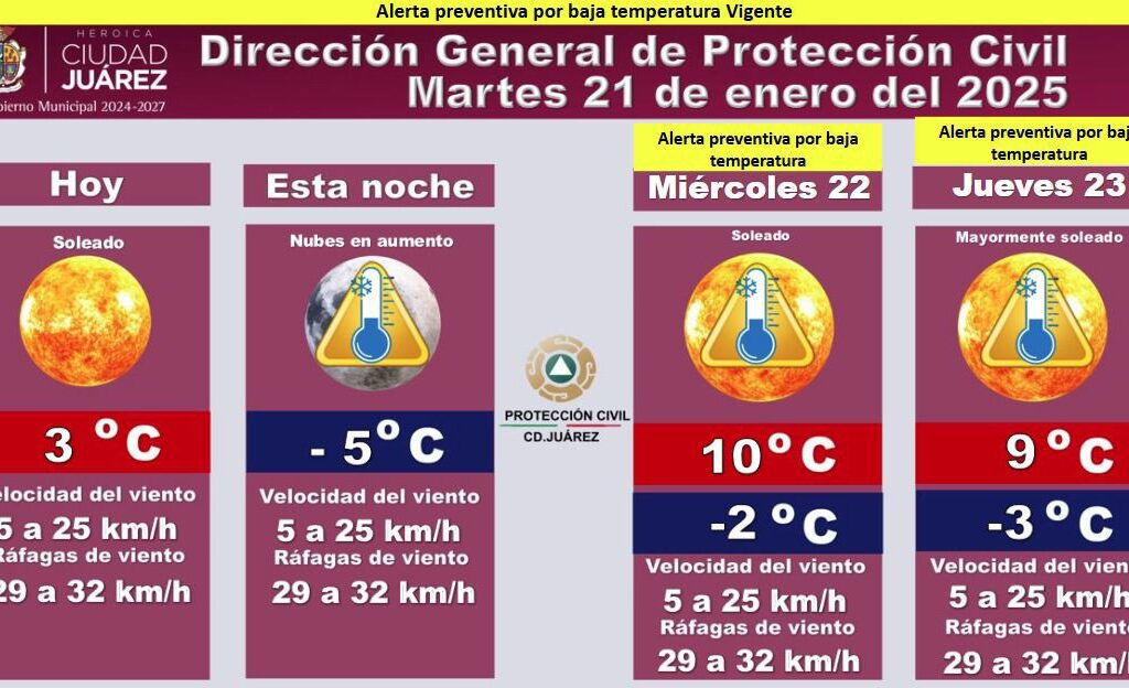 Martes 21 de Enero del 2025.- La Dirección General de Protección Civil informa que se mantiene activa una alerta preventiva por bajas temperaturas, con pronósticos que indican un descenso considerable en los próximos días. Para este martes 21 se prevé un día soleado con una temperatura máxima de 3 °C y una mínima de -5 °C durante la noche, acompañada…