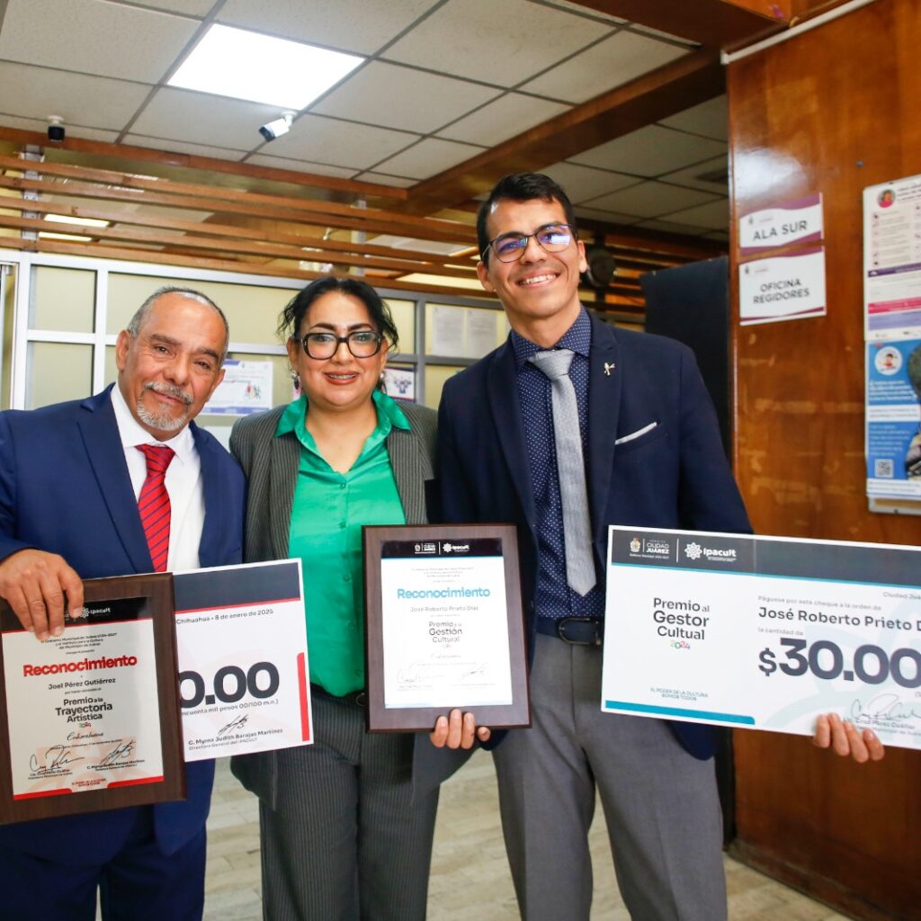 Miércoles 8 de Enero del 2025.- En la Sesión Ordinaria de Cabildo número 8, efectuada este día, se entregaron los premios a la Trayectoria Artística y al Gestor Cultural a Joel Pérez Gutiérrez y José Roberto Prieto Díaz, respectivamente, los cuales son otorgados por el Instituto para la Cultura del Municipio de Juárez (IPACULT) y la Comisión Edilicia de Cultura.…