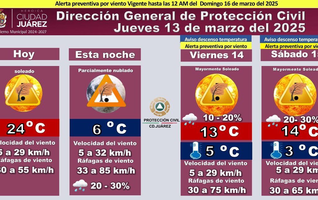 Jueves 13 de Marzo del 2025.- La Dirección General de Protección Civil emitió una alerta preventiva por viento vigente hasta las 12:00 de la noche del domingo 16 de marzo. Para este jueves 13 se prevé un día soleado con una temperatura máxima de 24 °C y vientos con velocidades de 5 a los 29 kilómetros por hora, con ráfagas…