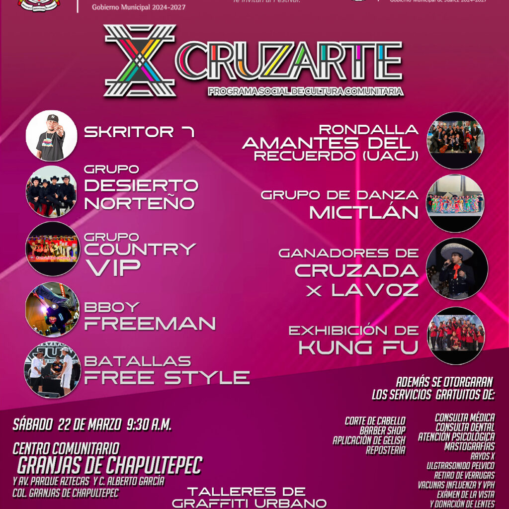 Gran Festival Cultural «CRUZARTE» en Granjas de Chapultepec Jueves 13 de Marzo del 2025.- El Gobierno Municipal de Juárez, a través de la Dirección General de Centros Comunitarios, invita a la comunidad a disfrutar del festival cultural «CRUZARTE», un evento del Programa Social de Cultura Comunitaria. Jesús Manuel García Reyes, titular de Centros Comunitarios, informó que el festival se llevará…