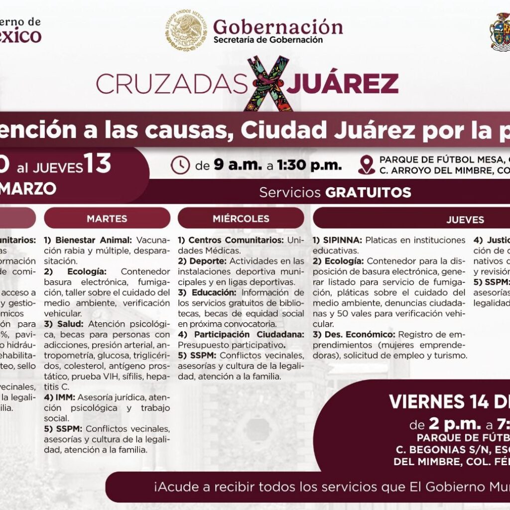 Lunes 10 de Marzo del 2025.- El próximo viernes 14 de marzo, de 2:00 de la tarde a las 7:30 de la noche, se va a llevar a cabo la tercera Cruzada por Juárez «Atención a las causas, Juárez por la Paz», en el Parque de Futbol Mesa, ubicado en la calle Begonias y Arroyo del Mimbre, en la colonia…