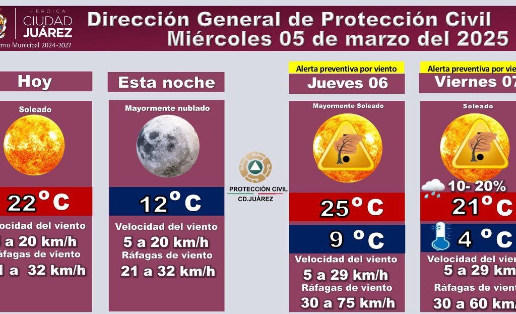 Miércoles 5 de Marzo del 2025.- La Dirección General de Protección Civil emitió el pronóstico del clima para los próximos días, advirtiendo sobre fuertes ráfagas de viento. Para este miércoles 5 se espera un día soleado con una temperatura máxima de 22°C y una mínima de 12°C por la noche, con cielo mayormente nublado. La velocidad del viento oscilará entre…
