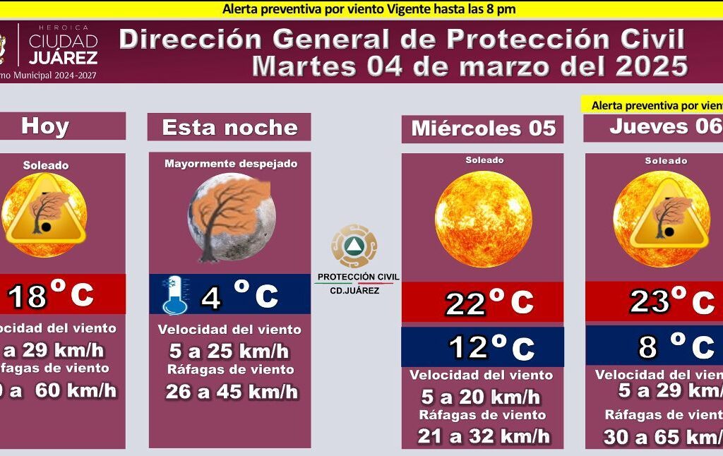 Martes 4 de Marzo del 2025.- La Dirección General de Protección Civil de Ciudad Juárez informa que la alerta preventiva por viento se mantiene vigente hasta las 8 p.m. de este martes 4 de marzo de 2025, se prevé variaciones en la velocidad del viento durante esta mañana y tarde, y que la velocidad del viento descienda lentamente entre 5…