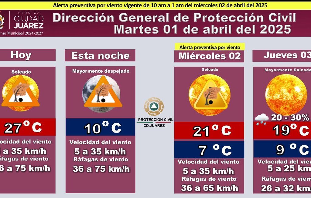 Martes 1 de Abril del 2025.- La Dirección General de Protección Civil emitió una alerta preventiva por vientos fuertes vigente desde las 10:00 de la mañana hasta la 1:00 de la madrugada del miércoles 2 de abril. Para este martes 1 de abril se espera un día soleado con una temperatura máxima de 27 °C, pero la velocidad del viento…