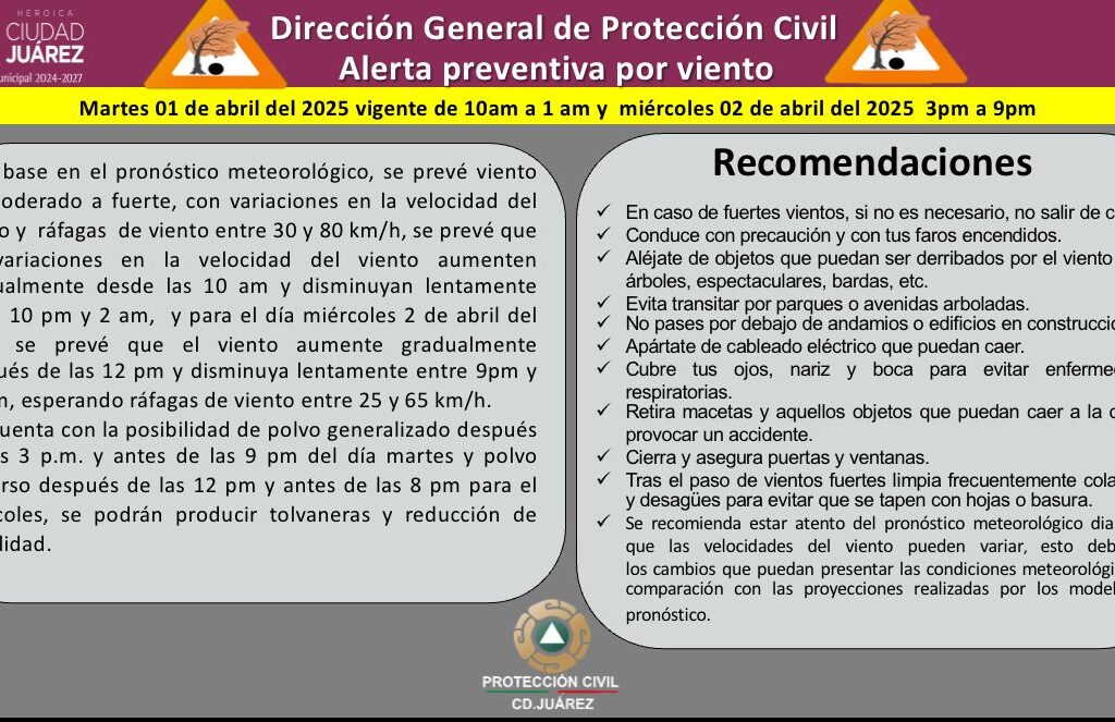 Martes 1 de Abril del 2025.- La Dirección de Protección Civil informó que actualmente se mantiene activa una alerta preventiva por viento, vigente para este día martes 1 de abril. De acuerdo con la proyección meteorológica, se espera que la velocidad del viento comience a incrementarse gradualmente después de las 10:00 de la mañana, alcanzando su punto máximo antes de…