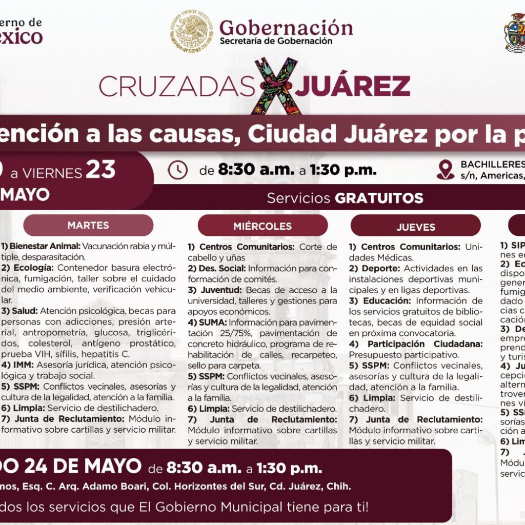 Lunes 19 de Mayo del 2025.- El próximo sábado 24 de mayo de 8:30 de la mañana a 1:30 de la tarde se realizará la Cruzada por Juárez Atención a las causas, Juárez por la Paz, en la calle Domingo García Ramos cruce con la Arq. Adamo Boari, en la colonia Horizontes del Sur. María Antonieta Mendoza Mendoza, titular de…
