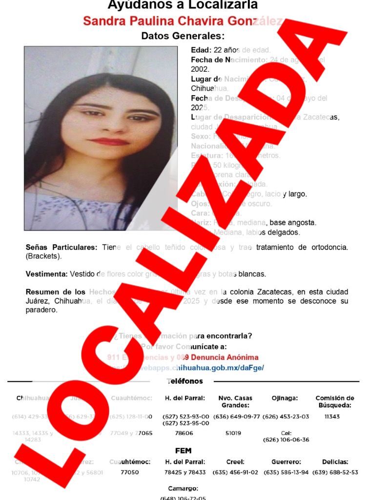 Ciudad Juárez, Chih., a 12 de mayo de 2025.- Era buscada desde el pasado 04 de mayo Elementos de la Fiscalía Especializada en Atención a Mujeres Víctimas del Delito por Razones de Género y a la Familia de la Zona Norte, localizaron sana y salva a Sandra Paulina C. G., quien contaba con reporte de desaparición y/o ausencia, interpuesto por…