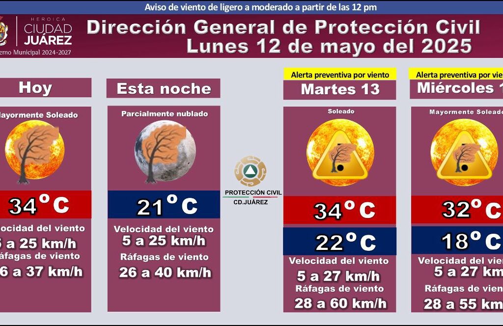 Lunes 12 de Mayo del 2025.- La Dirección General de Protección Civil emitió el pronóstico del clima para este lunes 12, destacando condiciones mayormente soleadas durante el día, con una temperatura máxima de 34 °C. Se espera viento con velocidad entre los 5 y los 25 kilómetros por hora y ráfagas que alcanzarán entre 26 y 37 kilómetros por hora.…