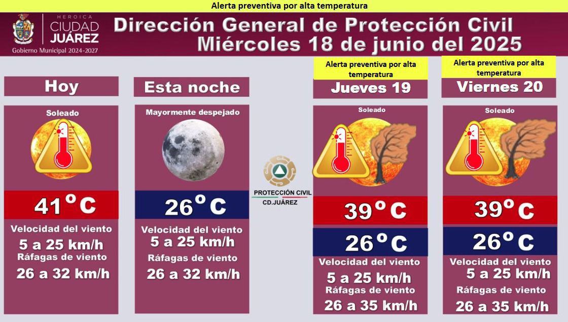 Miércoles 18 de Junio del 2025.- La Dirección General de Protección Civil emitió una alerta preventiva por alta temperatura para este miércoles 18, mañana jueves 19 y el viernes 20 de junio.