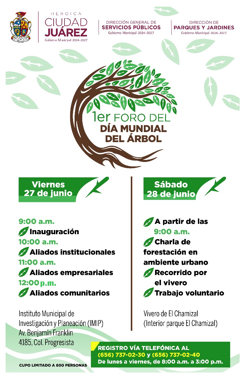 Jueves 19 de Junio del 2025.- Con el objetivo de fortalecer los lazos entre gobierno, empresas y sociedad civil para la mejora del espacio público, el viernes 27 de junio se llevará a cabo el primer foro del Día Mundial del Árbol en las instalaciones del Instituto Municipal de Investigación y Planeación (IMIP), en un horario de 9:00 de la mañana a 1:00 de la tarde.