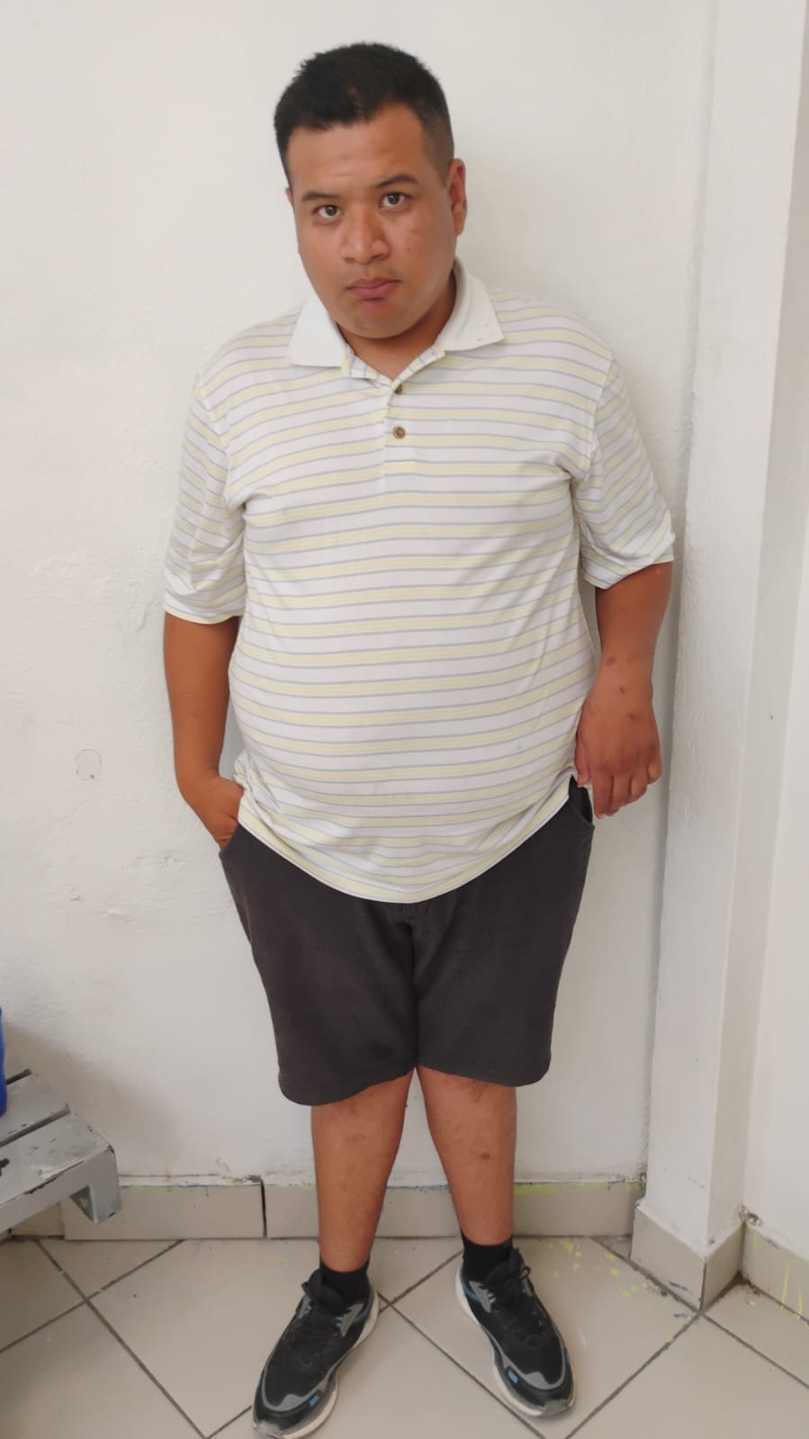 El ciudadano viste playera color blanco, short en color gris y calzado de color negro.
