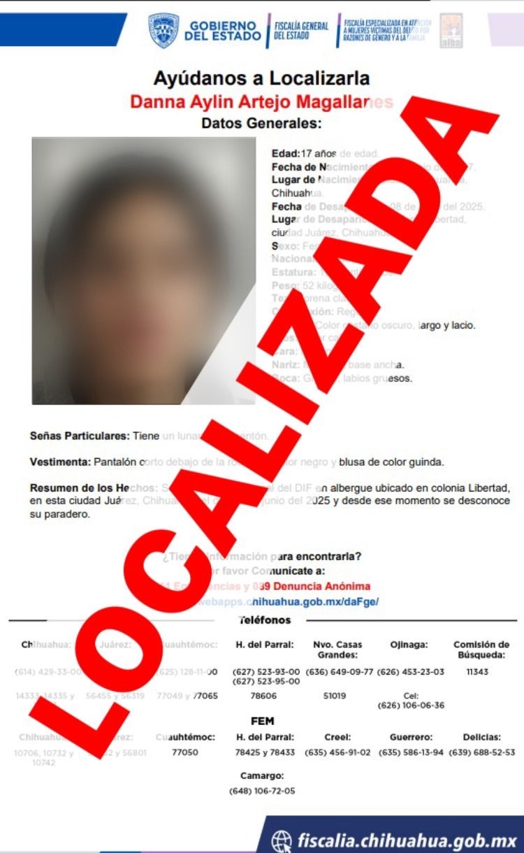 Ciudad Juárez, Chih., a 23 de junio de 2025.- La Fiscalía Especializada en Atención a Mujeres Víctimas del Delito por Razones de Género y a la Familia (FEM), localizó sana y salva a la adolescente de iniciales D. A. A. M., quien contaba con reporte de ausencia interpuesto el 08 de junio de 2025, en Ciudad Juárez.