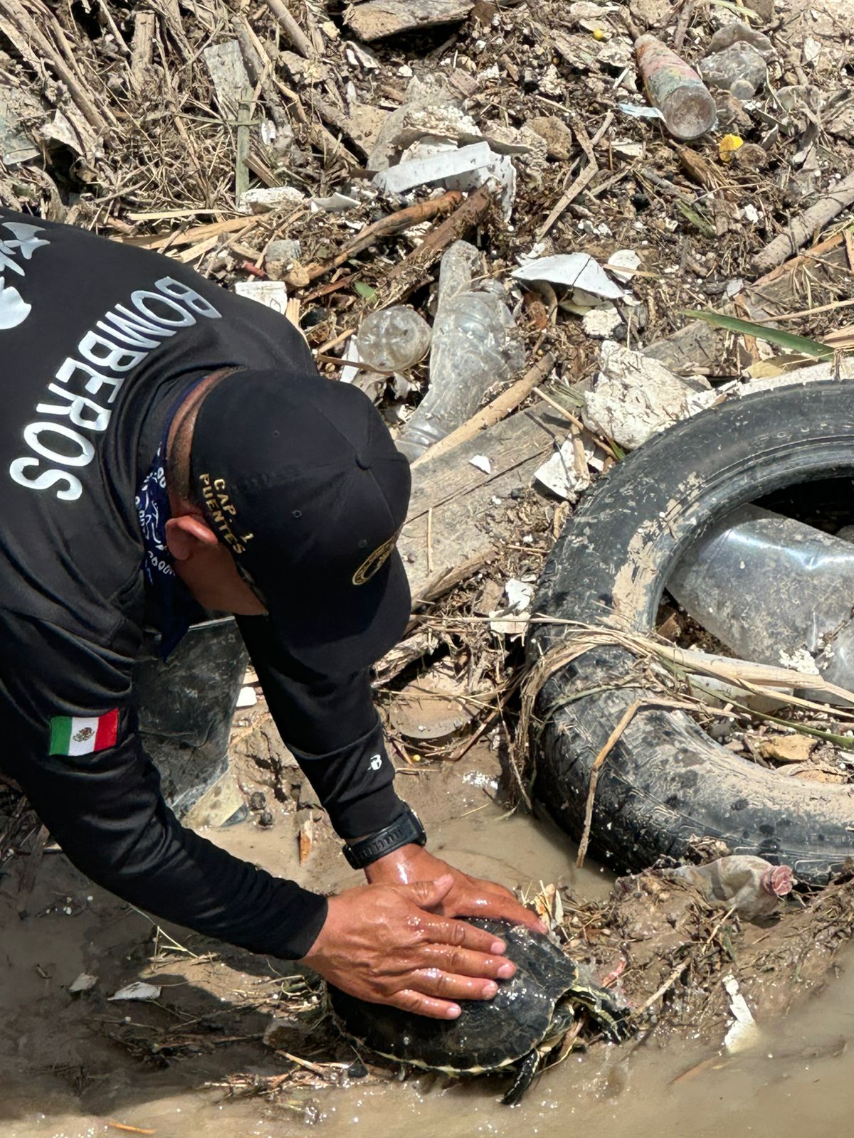 Jueves 26 de Junio del 2025.- Elementos del Departamento de Bomberos de Ciudad Juárez, adscritos a la Dirección General de Protección Civil, realizaron el rescate de una tortuga mientras llevaban a cabo trabajos de desazolve en un pozo de captación, informó Sergio Rodríguez, titular de la dependencia.