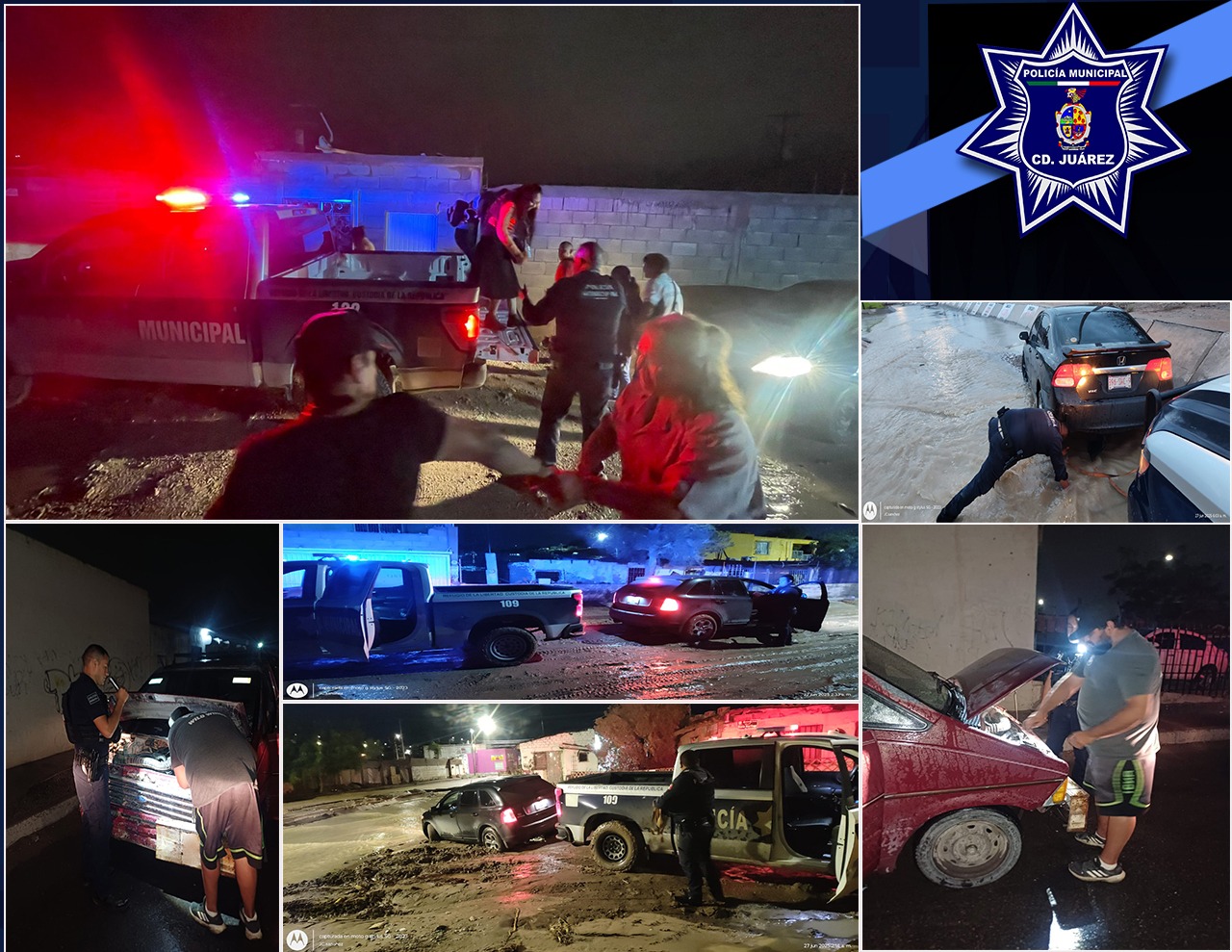El primer caso se efectuó en el cruce de las calles Juan Balderas y Escárcega Ceniceros, en la colonia Juanita Luna, luego de que un grupo de personas, cuatro mujeres y cuatro masculinos, fueron auxiliados por policías de la unidad C-132 para cruzar una laguna y ponerlos a salvo cuadras más adelante.