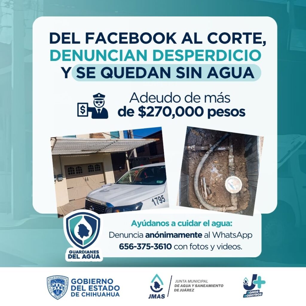La Junta de Agua y Saneamiento de Juárez atendió un reporte ciudadano hecho a través de redes sociales, en el que se denunciaba el riego excesivo al exterior de un domicilio ubicado en la calle Sandía, cuyos propietarios generaban desperdicio de agua potable. Los Guardianes del Agua de la J+ inspeccionaron el medidor y detectaron que el inmueble, donde se…