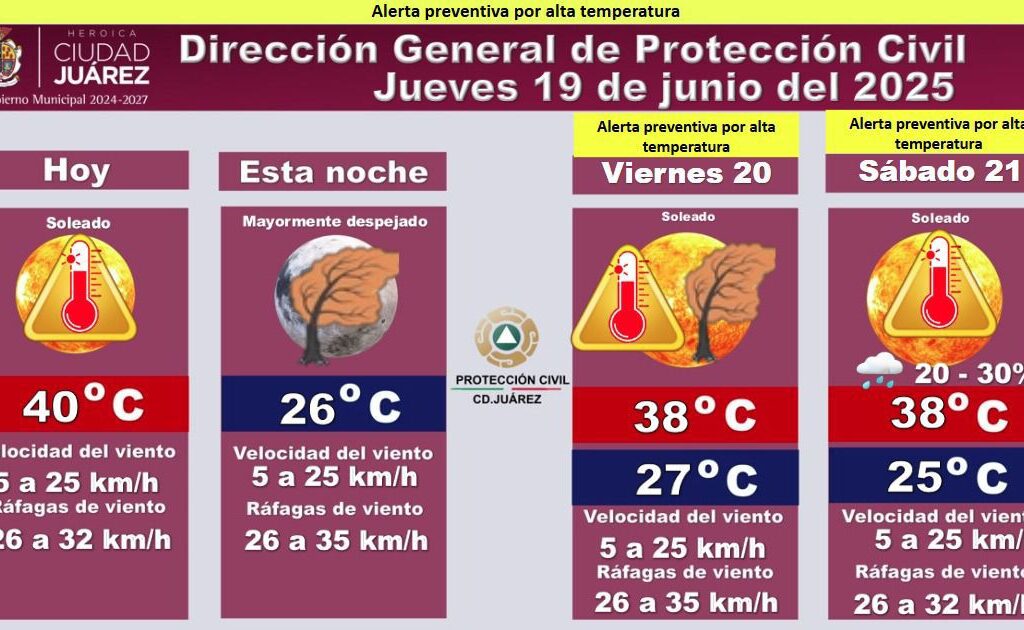 Jueves 19 de Junio del 2025.- La Dirección General de Protección Civil emitió una alerta preventiva por alta temperatura para este jueves 19, mañana viernes 20 y el sábado 21, ante el pronóstico de temperaturas extremas en la región. Hoy jueves se reporta una temperatura máxima de 40 °C, con cielo soleado y vientos de los 5 a los 25…
