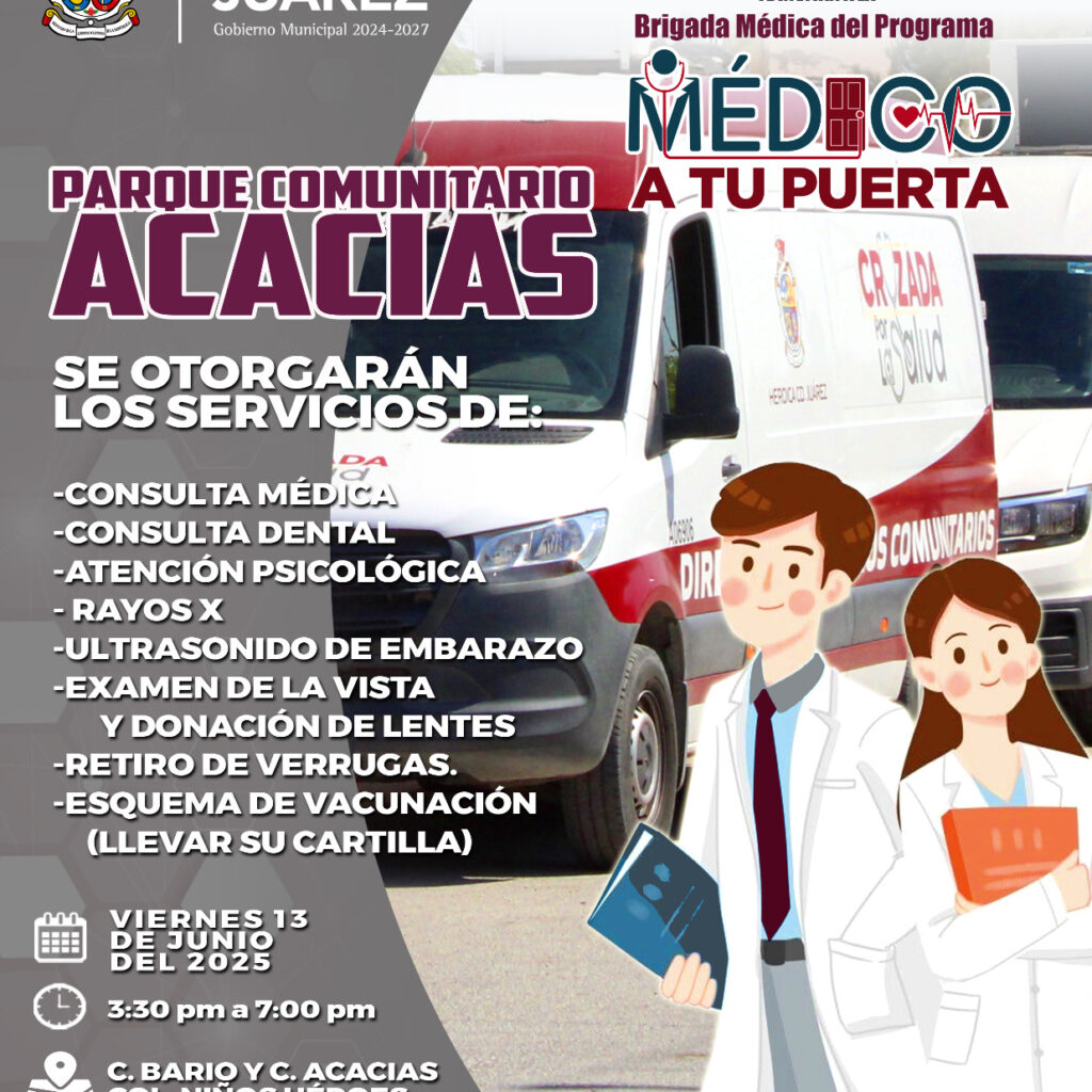 Viernes 13 de Junio del 2025.- El Gobierno Municipal, a través de la Dirección General de Centros Comunitarios, llevará a cabo hoy una brigada del programa Médico a tu Puerta al Parque Comunitario Acacias, ubicado en la calle Bario y Acacias, en la colonia Niños Héroes. La brigada de servicio se va a realizar este viernes 13 de junio de…
