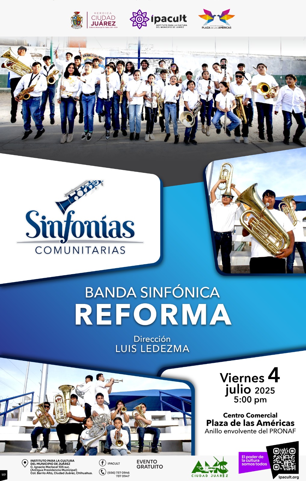 Jueves 3 de Julio del 2025.- El Instituto para la Cultura del Municipio de Juárez (IPACULT) invita a la ciudadanía a disfrutar del concierto que ofrecerá la Banda Sinfónica Reforma este viernes 4 de julio a las 5:00 de la tarde, en el interior del centro comercial Plaza de las Américas.
