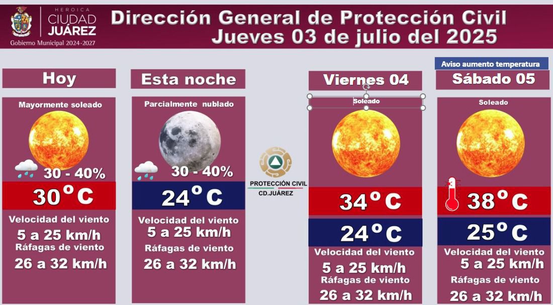 Jueves 3 de Julio del 2025.- La Dirección General de Protección Civil informó el pronóstico del clima correspondiente al jueves 3 de julio de 2025 y los próximos días.