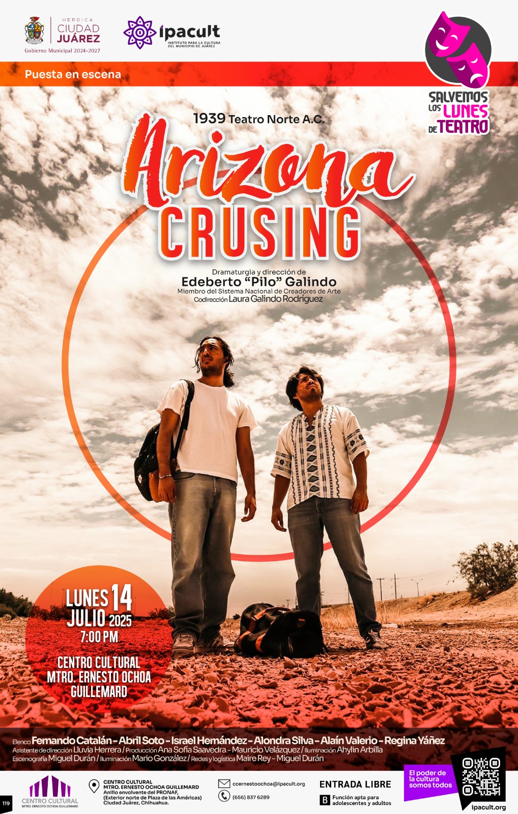Jueves 10 de Julio del 2025.- Como parte del programa Salvemos los lunes de teatro, el Instituto para la Cultura del Municipio de Juárez (IPACULT) invita a la presentación de la obra “Arizona Cruising”, el próximo lunes 14 de julio a las 7:00 de la tarde en el Centro Cultural Ernesto Ochoa Guillemard.