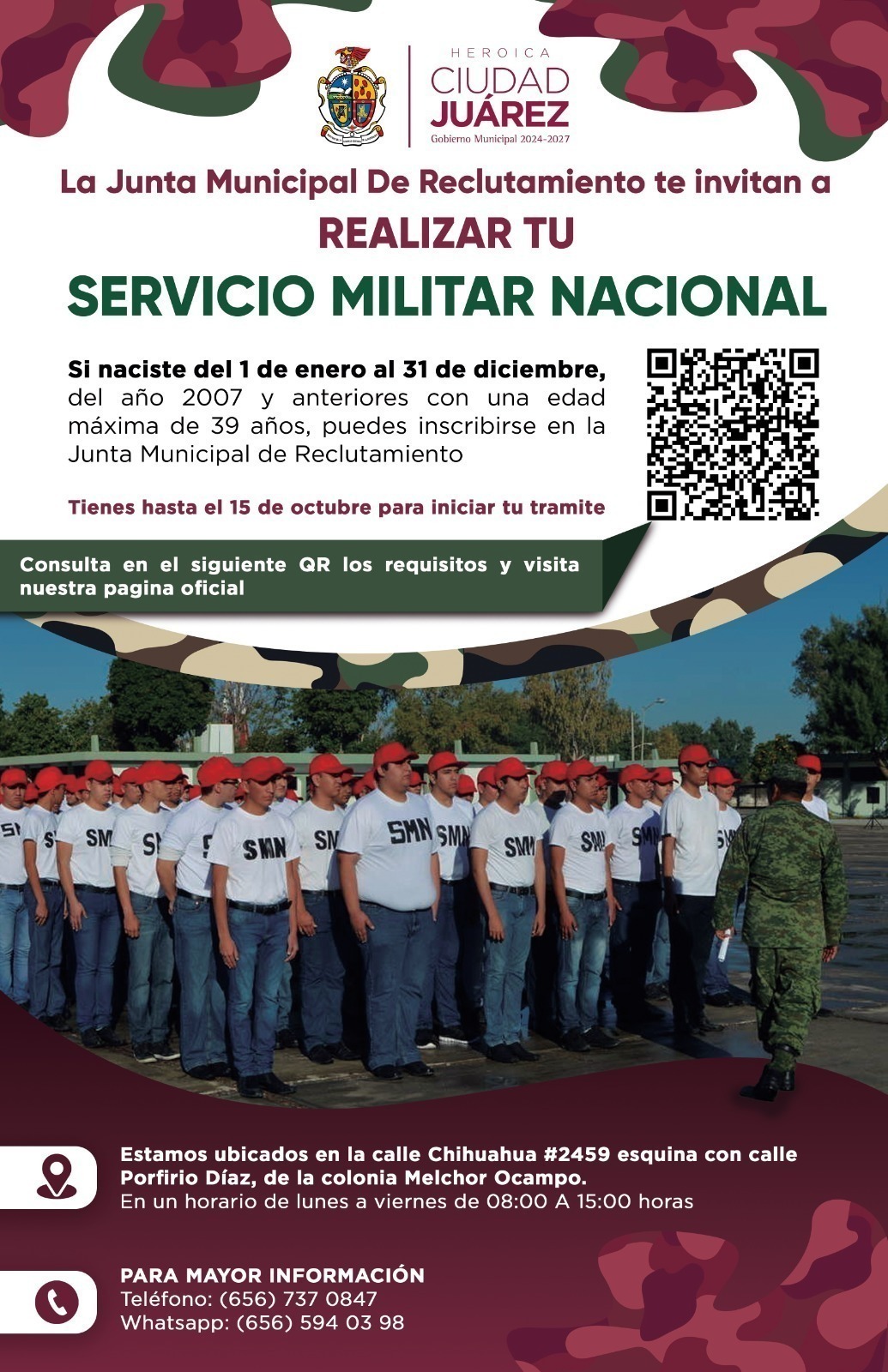 Jueves 10 de Julio del 2025.- La Junta Municipal de Reclutamiento de Ciudad Juárez convoca a los jóvenes a registrarse para cumplir con el Servicio Militar Nacional y obtener su Cartilla Militar.