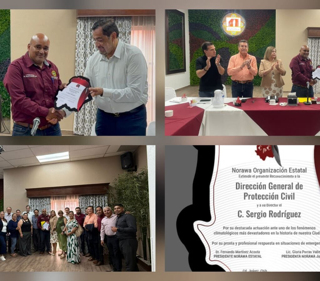 Ciudad Juárez, 12 de julio 2025— Este sábado, la Asociación Civil Norawa entregó un reconocimiento especial a la Dirección de Protección Civil del Municipio y a su director, Sergio Rodríguez, por la destacada labor realizada durante la tromba registrada en días recientes, que dejó a varias familias afectadas en la ciudad. El presidente estatal de Norawa, Fernando Martínez Acosta, fue…
