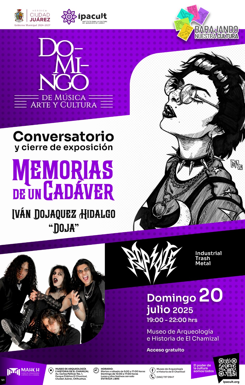 Lunes 14 de Julio del 2025.- El Instituto para la Cultura del Municipio de Juárez (IPACULT) invita a la comunidad fronteriza a despedir la exposición Memorias de un cadáver, del artista visual Iván Dojaquez Hidalgo, mejor conocido como Doja, con un evento especial que combinará arte, diálogo y música en vivo este domingo 20 de julio a las 7:00 de la tarde en el Museo de Arqueología e Historia de El Chamizal (MAHCH).