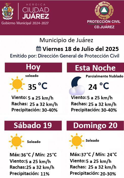 Viernes 18 de Julio del 2025.- La Dirección General de Protección Civil del Municipio emitió el pronóstico del clima para este viernes 18 de julio, en el cual se anticipa un día soleado con una temperatura máxima de 35 grados Celsius.