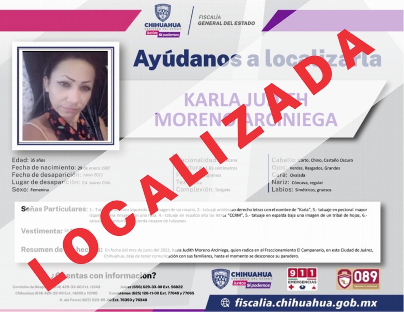Ciudad Juárez, Chih., a 19 de julio de 2025.- La Fiscalía Especializada en Atención a Mujeres Víctimas del Delito por Razones de Género y a la Familia (FEM), localizó sana y salva a una mujer de iniciales K. J. M. A., quien contaba con reporte de ausencia interpuesto en junio del año 2021, en Ciudad Juárez