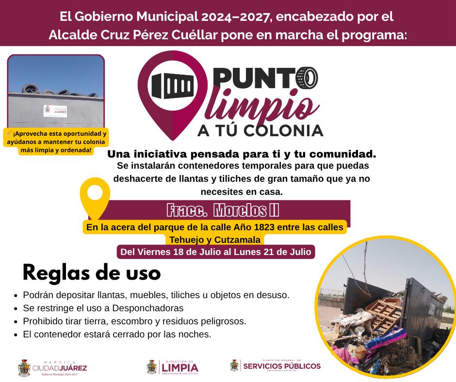 Sábado 19 de Julio del 2025.- La Dirección de Limpia habilita desde ayer y hasta el lunes 21 de julio cinco nuevos Puntos Limpios en distintos sectores de la ciudad, con el propósito de facilitar a los juarenses la disposición adecuada de residuos voluminosos o de difícil manejo, como muebles, colchones, ramas y llantas.