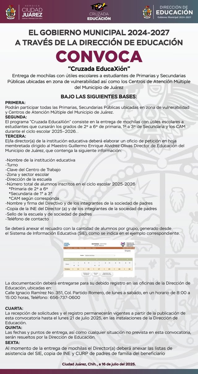 Alvídrez Olivas recordó que los directivos que deseen recibir estos beneficios deben entregar hoy o mañana un oficio en hoja membretada dirigido al maestro Guillermo Enrique Alvídrez Olivas, director de Educación del Municipio de Juárez; incluyendo el nombre de la institución educativa, nivel escolar, turno, clave del centro de trabajo, zona, sector escolar y dirección de la escuela.