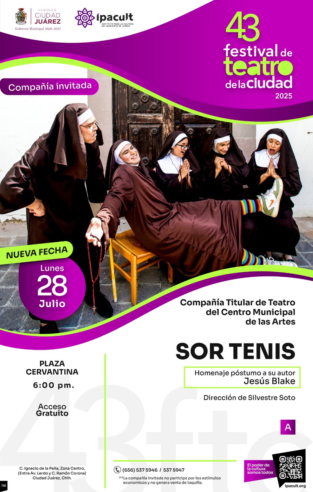 Lunes 21 de Julio del 2025.- El Instituto para la Cultura del Municipio de Juárez (IPACULT) informa que, debido a las condiciones climatológicas que se presentan en la ciudad, la función inaugural del Festival de Teatro de la Ciudad con la obra “Sor Tenis” ha sido reprogramada.