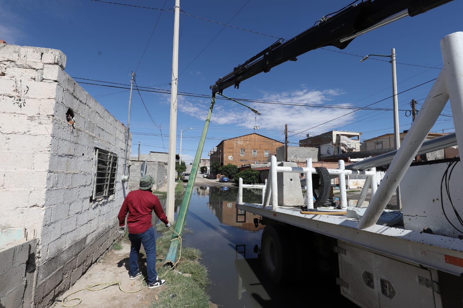 Señaló que debido a los charcos formados por las recientes lluvias, no fue posible hacer la reposición del nuevo arbotante, sin embargo, una vez que baje el nivel del agua, harán instalación base de concreto nueva, además se colocará un arbotante nuevo, así como brazo, luminarias y cableado.
