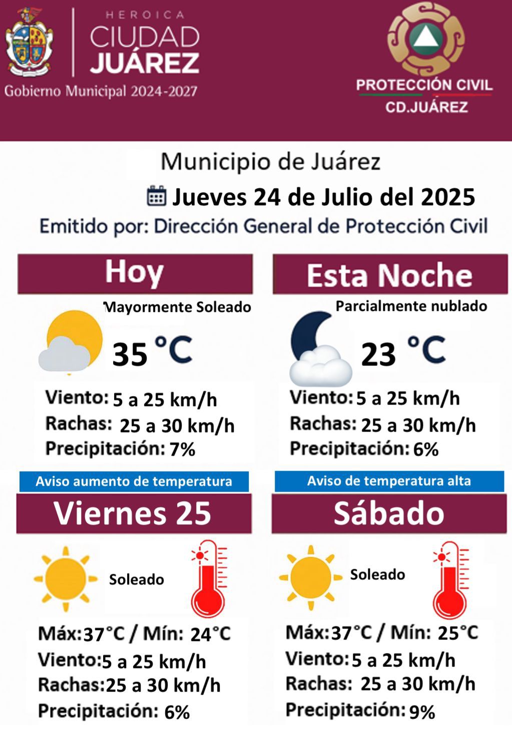 Jueves 24 de Julio del 2025.- La Dirección General de Protección Civil del Municipio de Juárez emitió el pronóstico del clima para el jueves 24 de julio de 2025, destacando condiciones mayormente soleadas durante el día, con una temperatura máxima de 35 grados centígrados, vientos de 5 a 25 km/h y rachas de hasta 30 km/h. La probabilidad de precipitación se mantiene baja, con un 7 por ciento.