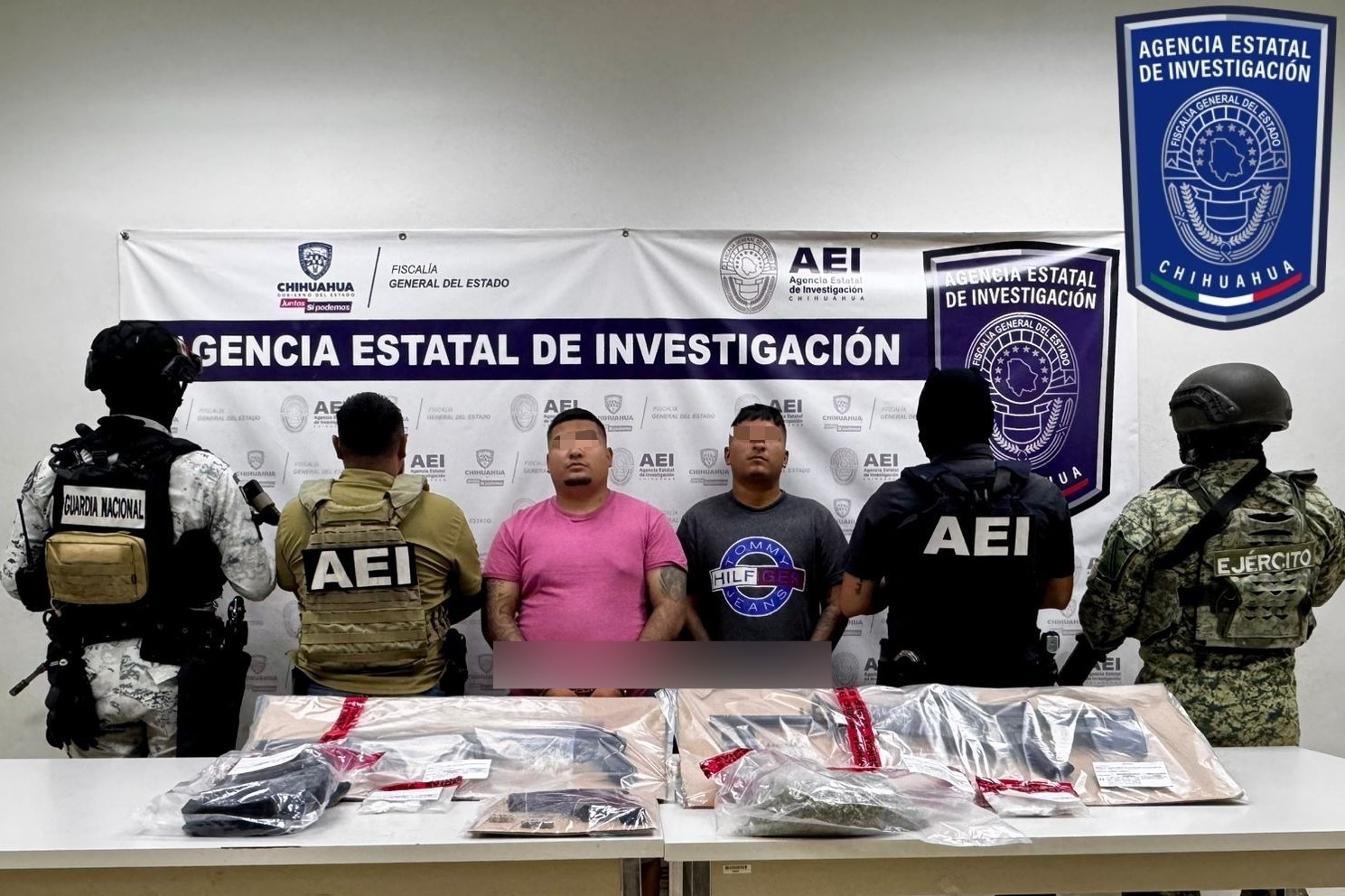 Ciudad Juárez, Chih., a 25 de julio de 2025.- Elementos de la Agencia Estatal de Investigación, adscritos a la Fiscalía de Distrito Zona Norte, detuvieron a quienes se identificaron como, Ángel Jair O. R., y Samuel Alejandro O. R., por el delito de posesión ilegal de armas de fuego y delitos contra la salud, registrado en la colonia Renovación 92, en Ciudad Juárez.